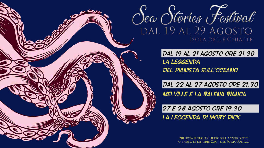 Ritorna lo spettacolo sulla suggestiva Isola delle chiatte con Sea Stories Festival. Il primo appuntamento del 2024 è con La leggenda del Pianista sull’Oceano messo in scena dalla Compagnia Chierici Cicolella e in programma il 19, 20 e 21 agosto.
