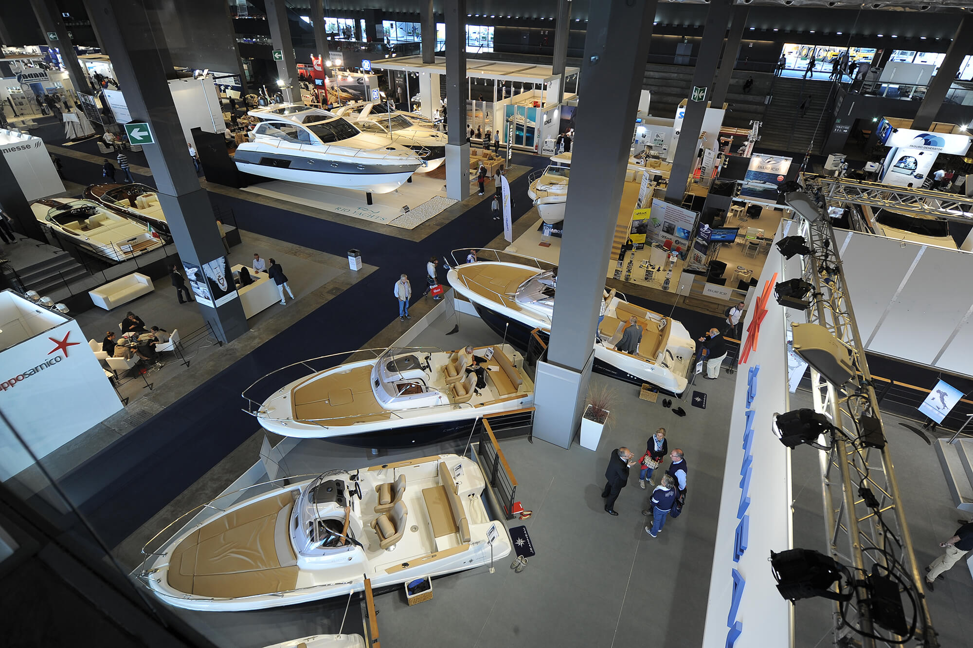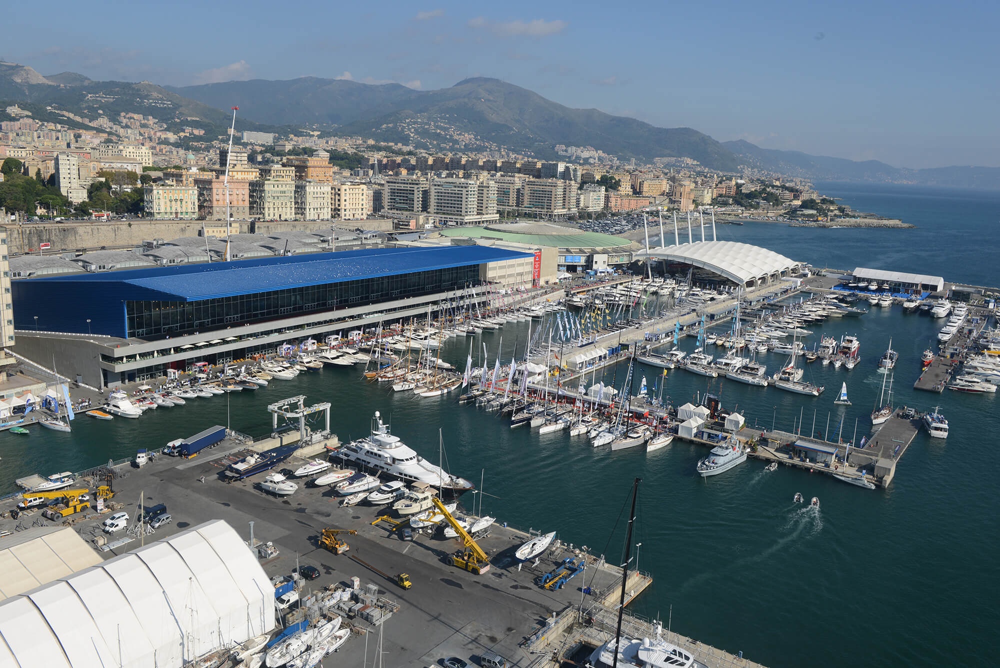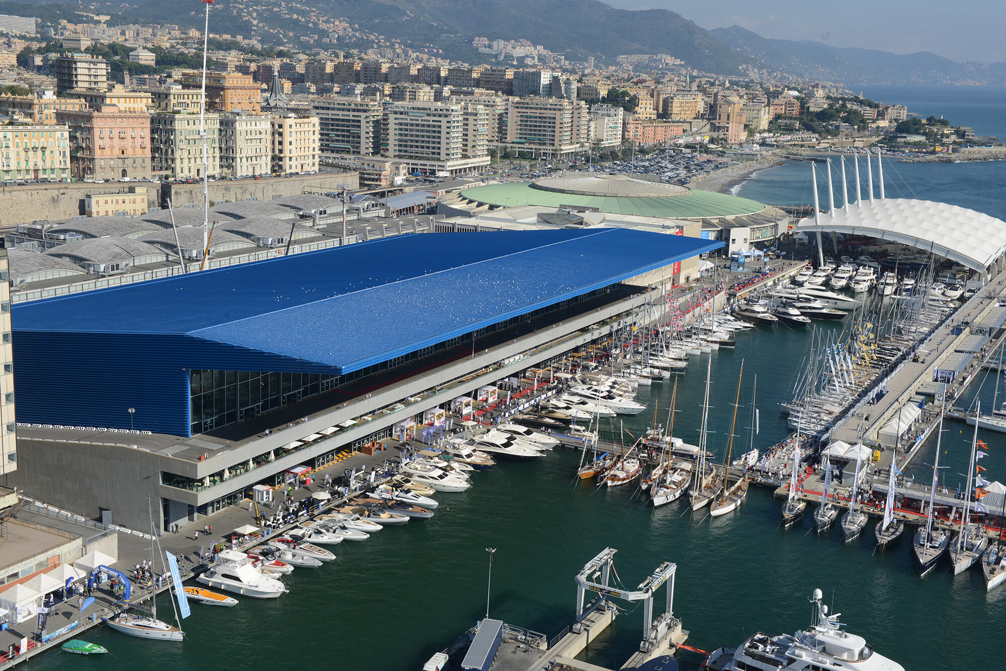 Non esiste separazione tra contenitore e ambiente circostante diversamente da quanto accade di norma nei padiglioni fieristici. Il grande tetto a sbalzo costituisce copertura per le terrazze e per le barche ormeggiate in banchina, le grandi vetrate e le stesse terrazze garantiscono la continuità tra l’interno e lo spazio circostante, le marine, e una visuale aperta a centottanta grandi sull’ingresso del porto con il viavai di navi da carico e da crociera.