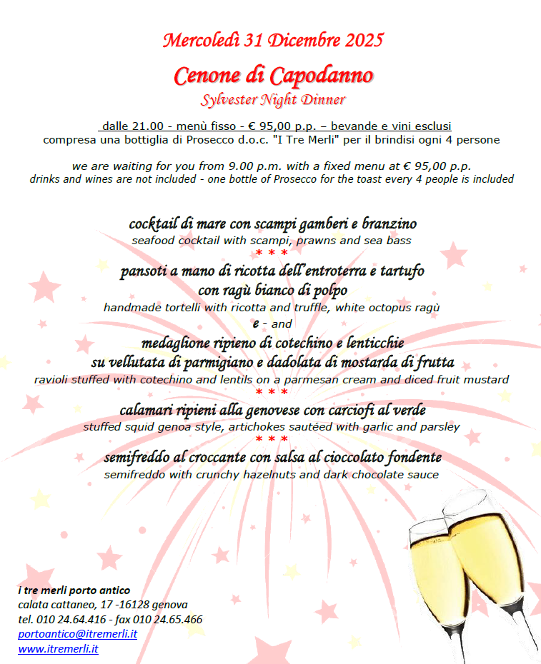 Il mare, le luci del Porto Antico e il calore delle feste: ai Tre Merli ti aspettano due appuntamenti speciali per vivere tutta la magia del periodo più bello dell’anno, tra gusto, eleganza e atmosfera unica.